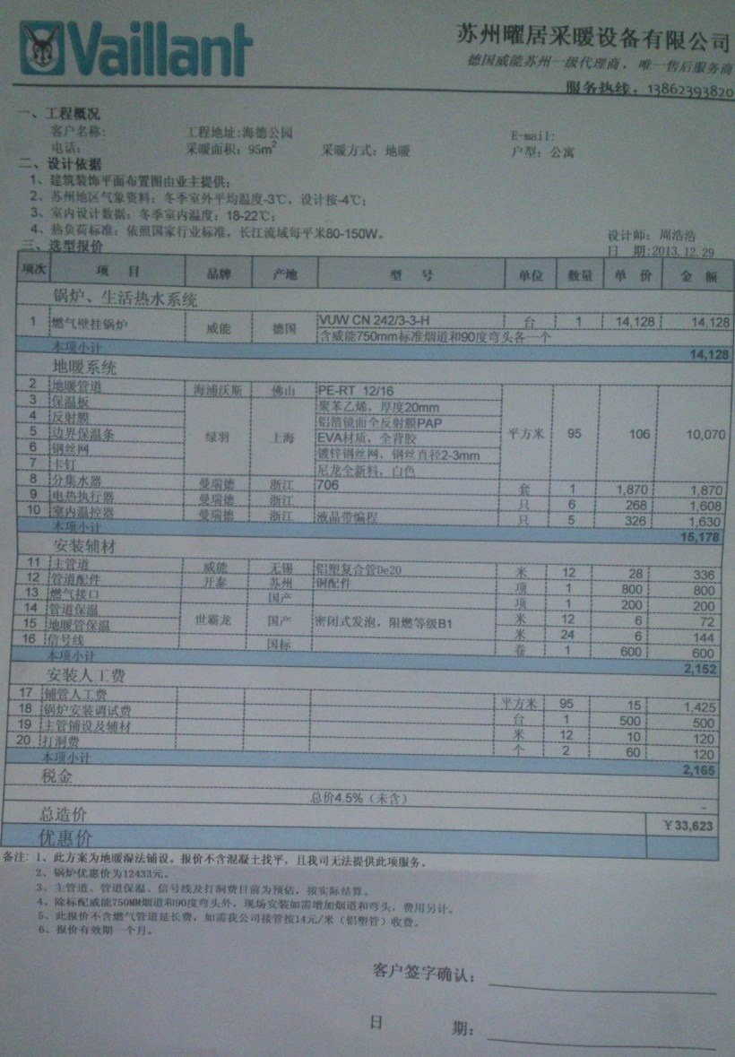 威能的24kw的壁挂炉 + 英国海浦沃斯的地暖管 + 曼瑞德的一堆+ 绿羽的辅材 = 20345 + 2米的烟道x470元/米 = 21280