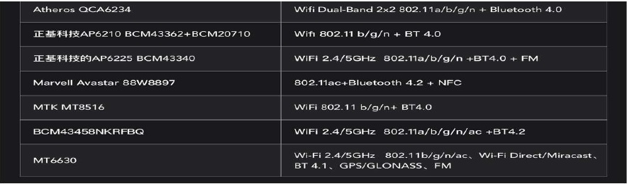 wifi/bt | 主控集成 | BROADCOM博通BCM43570KFFBG 802.11ac 千兆WiFi模块,集成蓝牙Bluetooth 4.1 和EDR | 海华无线模组 | AP6255,WIFI双频+BT4.2模块 | MT7668 | 主控集成 |