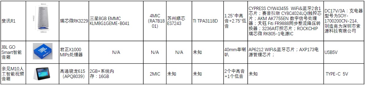 智能音箱类产品 | 产品外形图 | 音频相关芯片 拆解图 | 主控芯片名 | 备注说明 |