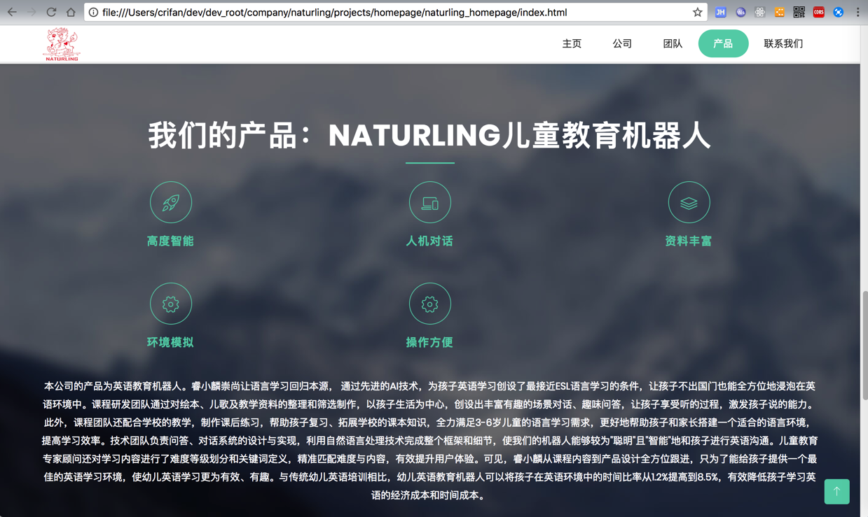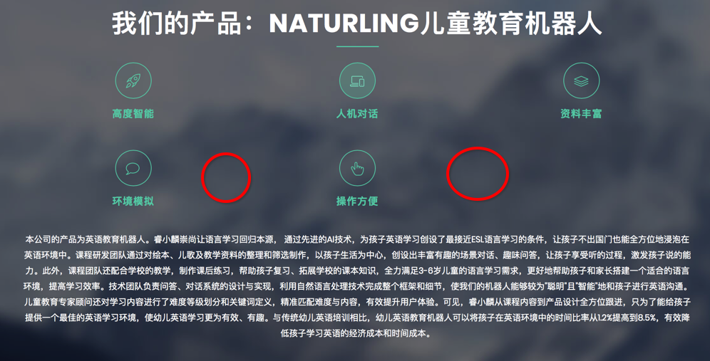 &lt;p class="section-subtitle"&gt;本公司的产品为英语教育机器人。睿小麟崇尚让语言学习回归本源, 通过先进的AI技术,为孩子英语学习创设了最接近ESL语言学习的条件,让孩子不出国门也能全方位地浸泡在英语环境中。课程研发团队通过对绘本、儿歌及教学资料的整理和筛选制作,以孩子生活为中心,创设出丰富有趣的场景对话、趣味问答,让孩子享受听的过程,激发孩子说的能力。此外,课程团队还配合学校的教学,制作课后练习,帮助孩子复习、拓展学校的课本知识,全力满足3-6岁儿童的语言学习需求,更好地帮助孩子和家长搭建一个适合的语言环境,提高学习效率。技术团队负责问答、对话系统的设计与实现,利用自然语言处理技术完成整个框架和细节,使我们的机器人能够较为"聪明"且"智能"地和孩子进行英语沟通。儿童教育专家顾问还对学习内容进行了难度等级划分和关键词定义,精准匹配难度与内容,有效提升用户体验。可见,睿小麟从课程内容到产品设计全方位跟进,只为了能给孩子提供一个最佳的英语学习环境,使幼儿英语学习更为有效、有趣。与传统幼儿英语培训相比,幼儿英语教育机器人可以将孩子在英语环境中的时间比率从1.2%提高到8.5%,有效降低孩子学习英语的经济成本和时间成本。 &lt;/p&gt;