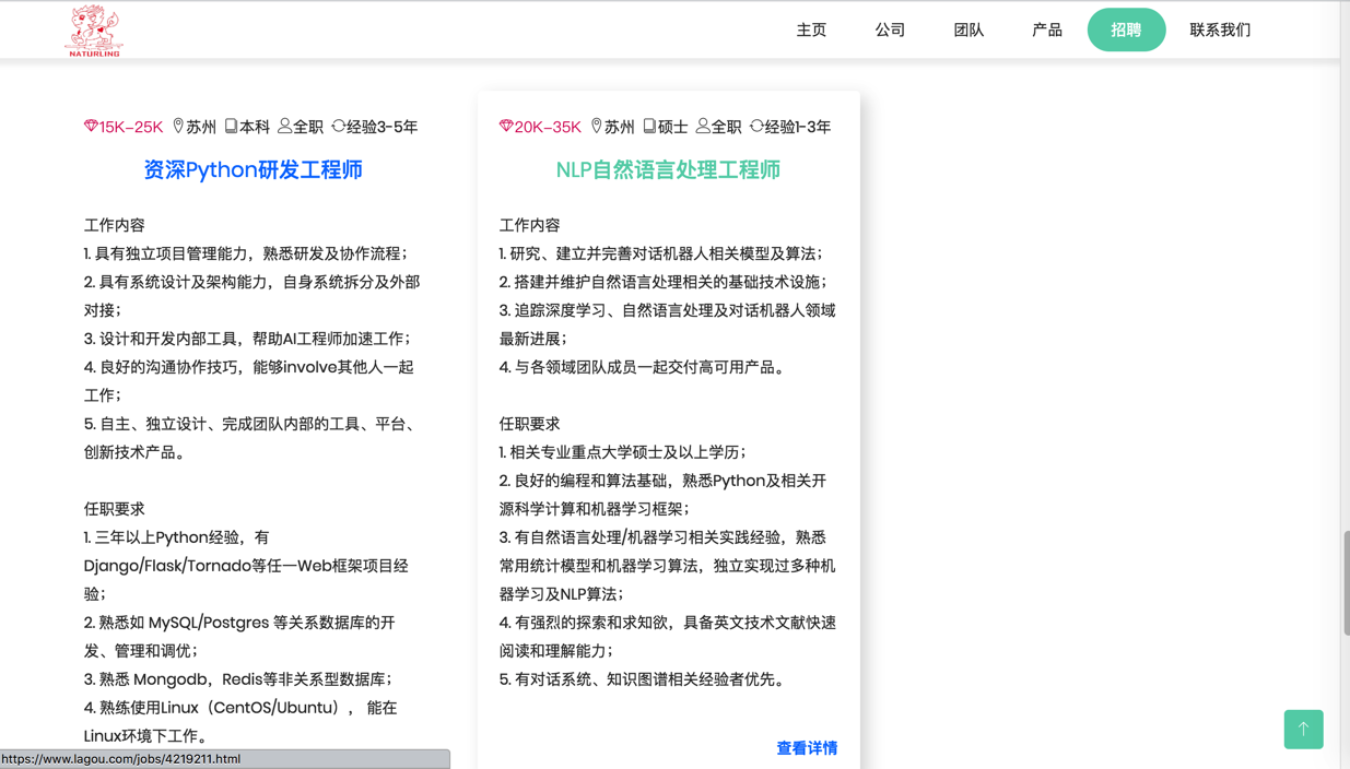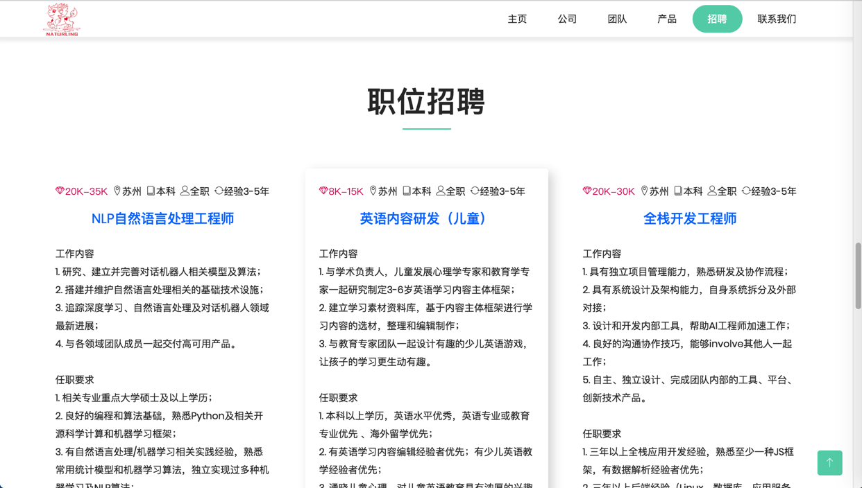 <code> <!-- Career Section --> <section id="career" class="section"> <!-- Container Starts --> <div class="container"> <div class="section-header"> <h2 class="section-title">职位招聘</h2> <hr class="lines"> <!-- <div class="row"> <div class="col-lg-12 col-md-12 col-xs-12"> <div class="container"> <div class="row"> <div class="col-lg-4 col-sm-4 col-xs-12 box-item"> <span class="icon"> <i class="lnr lnr-rocket"></i> </span> <div class="text"> <h4>高度智能</h4> </div> </div> <div class="col-lg-4 col-sm-4 col-xs-12 box-item"> <span class="icon"> <i class="lnr lnr-laptop-phone"></i> </span> <div class="text"> <h4>人机对话</h4> </div> </div> <div class="col-lg-4 col-sm-4 col-xs-12 box-item"> <span class="icon"> <i class="lnr lnr-layers"></i> </span> <div class="text"> <h4>资料丰富</h4> </div> </div> </div> <div class="row"> <div class="col-lg-6 col-sm-6 col-xs-12 box-item"> <span class="icon move-right"> <i class="lnr lnr-bubble"></i> </span> <div class="text move-right"> <h4>环境模拟</h4> </div> </div> <div class="col-lg-6 col-sm-6 col-xs-12 box-item"> <span class="icon move-left"> <i class="lnr lnr-pointer-up"></i> </span> <div class="text move-left"> <h4>操作方便</h4> </div> </div> </div> </div> </div> </div> --> <div class="row d-md-flex mt-5"> <div class="col-sm-4 mt-2 wow fadeIn"> <div class="card"> <div class="card-body"> <p class="card-text small-xl"> <em class="lnr lnr-diamond text-primary">20K-35K</em>&nbsp; <em class="lnr lnr-map-marker"></em>苏州&nbsp; <em class="lnr lnr-book"></em>本科&nbsp; <em class="lnr lnr-user"></em>全职&nbsp; <em class="lnr lnr-sync"></em>经验3-5年 </p> <h6 class="card-title"> <a target="_blank" href="https://www.lagou.com/jobs/3952989.html">NLP自然语言处理工程师</a> </h6> <p class="card-text"> 工作内容<br/> 1. 研究、建立并完善对话机器人相关模型及算法;<br/> 2. 搭建并维护自然语言处理相关的基础技术设施;<br/> 3. 追踪深度学习、自然语言处理及对话机器人领域最新进展;<br/> 4. 与各领域团队成员一起交付高可用产品。<br/> <br/> 任职要求<br/> 1. 相关专业重点大学硕士及以上学历;<br/> 2. 良好的编程和算法基础,熟悉Python及相关开源科学计算和机器学习框架;<br/> 3. 有自然语言处理/机器学习相关实践经验,熟悉常用统计模型和机器学习算法,独立实现过多种机器学习及NLP算法;<br/> 4. 有强烈的探索和求知欲,具备英文技术文献快速阅读和理解能力;<br/> 5. 有对话系统、知识图谱相关经验者优先。 </p> </div> <div class="card-body text-right"> <a target="_blank" href="https://www.lagou.com/jobs/3952989.html" class="card-link"> <strong>查看详情</strong> </a> </div> </div> </div> <div class="col-sm-4 mt-2 wow fadeIn"> <div class="card"> <div class="card-body"> <p class="card-text small-xl"> <em class="lnr lnr-diamond text-primary">8K-15K</em>&nbsp; <em class="lnr lnr-map-marker"></em>苏州&nbsp; <em class="lnr lnr-book"></em>本科&nbsp; <em class="lnr lnr-user"></em>全职&nbsp; <em class="lnr lnr-sync"></em>经验3-5年 </p> <h6 class="card-title"> <a target="_blank" href="https://www.lagou.com/jobs/3957798.html">英语内容研发(儿童)</a> </h6> <p class="card-text"> 工作内容<br/> 1. 与学术负责人,儿童发展心理学专家和教育学专家一起研究制定3-6岁英语学习内容主体框架;<br/> 2. 建立学习素材资料库,基于内容主体框架进行学习内容的选材,整理和编辑制作;<br/> 3. 与教育专家团队一起设计有趣的少儿英语游戏,让孩子的学习更生动有趣。<br/> <br/> 任职要求<br/> 1. 本科以上学历,英语水平优秀,英语专业或教育专业优先 、海外留学优先;<br/> 2. 有英语学习内容编辑经验者优先;有少儿英语教学经验者优先;<br/> 3. 通晓儿童心理,对儿童英语教育具有浓厚的兴趣和热情,能深刻理解用户需求;<br/> 4. 学习能力强,好奇心强,思维活跃,善于表达和沟通想法,敢想敢创新;<br/> 5. 有责任心,工作认真细致,较好的团队合作意识和沟通能力。 </p> </div> <div class="card-body text-right"> <a target="_blank" href="https://www.lagou.com/jobs/3957798.html" class="card-link"> <strong>查看详情</strong> </a> </div> </div> </div> <div class="col-sm-4 mt-2 wow fadeIn"> <div class="card"> <div class="card-body"> <p class="card-text small-xl"> <em class="lnr lnr-diamond text-primary">20K-30K</em>&nbsp; <em class="lnr lnr-map-marker"></em>苏州&nbsp; <em class="lnr lnr-book"></em>本科&nbsp; <em class="lnr lnr-user"></em>全职&nbsp; <em class="lnr lnr-sync"></em>经验3-5年 </p> <h6 class="card-title"> <a target="_blank" href="https://www.lagou.com/jobs/3952968.html">全栈开发工程师</a> </h6> <p class="card-text"> 工作内容<br/> 1. 具有独立项目管理能力,熟悉研发及协作流程;<br/> 2. 具有系统设计及架构能力,自身系统拆分及外部对接;<br/> 3. 设计和开发内部工具,帮助AI工程师加速工作;<br/> 4. 良好的沟通协作技巧,能够involve其他人一起工作;<br/> 5. 自主、独立设计、完成团队内部的工具、平台、创新技术产品。<br/> <br/> 任职要求<br/> 1. 三年以上全栈应用开发经验,熟悉至少一种JS框架,有数据解析经验者优先;<br/> 2. 三年以上后端经验(Linux、数据库、应用服务器);<br/> 3. 三年以上网络技术经验:PHP、Java、JavaScript、XHTML、CSS;<br/> 4. 热爱数据,具备良好的逻辑思考能力,快速学习能力,较强的定位问题、解决问题的能力;<br/> 5. 有很强的自我驱动力、 结果导向并极具责任感;有良好沟通能力和团队协作精神。 </p> </div> <div class="card-body text-right"> <a target="_blank" href="https://www.lagou.com/jobs/3952968.html" class="card-link"> <strong>查看详情</strong> </a> </div> </div> </div> <div class="col-sm-4 mt-2 wow fadeIn"> <div class="card"> <div class="card-body
