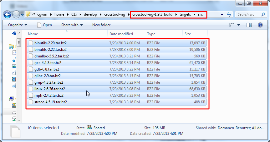 CLi@PC-CLI-1 ~/develop/crosstool-ng/crosstool-ng-1.9.3_build $ ct-ng build [INFO ] Performing some trivial sanity checks [INFO ] Build started 20130723.154847 [INFO ] Building environment variables [EXTRA] Preparing working directories [EXTRA] Installing user-supplied crosstool-NG configuration [EXTRA] ================================================================= [EXTRA] Dumping internal crosstool-NG configuration [EXTRA] Building a toolchain for: [EXTRA] build = i686-pc-cygwin [EXTRA] host = i686-pc-cygwin [EXTRA] target = arm-xscale-linux-gnueabi [EXTRA] Dumping internal crosstool-NG configuration: done in 0.90s (at 00:30) [INFO ] ================================================================= [INFO ] Retrieving needed toolchain components' tarballs [EXTRA] Retrieving 'binutils-2.20' [02:11] /