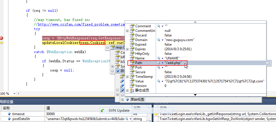 解析后的cookie,但是,由于C#的解析Set-Cookie有bug,导致解析出来的cookie,虽然其他值都对,包括name是UNAME,但是path的值却出错了: