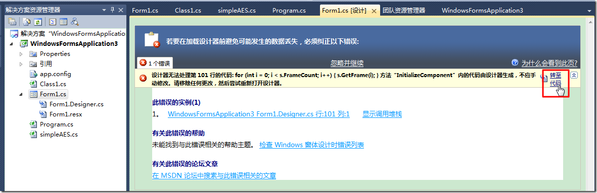 用VS打开后,双击Form1.cs去打开,结果出错: