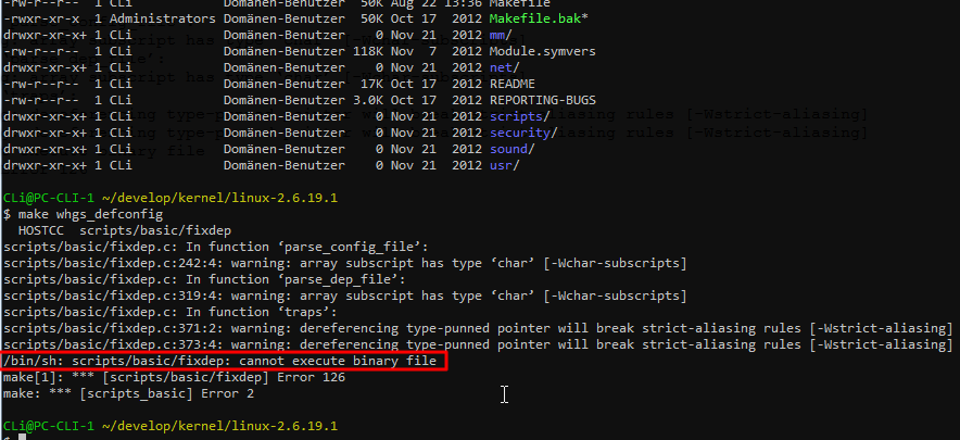 CLi@PC-CLI-1 ~/develop/kernel/linux-2.6.19.1 $ make whgs_defconfig HOSTCC scripts/basic/fixdep scripts/basic/fixdep.c: In function ‘parse_config_file’: scripts/basic/fixdep.c:242:4: warning: array subscript has type ‘char’ [-Wchar-subscripts] scripts/basic/fixdep.c: In function ‘parse_dep_file’: scripts/basic/fixdep.c:319:4: warning: array subscript has type ‘char’ [-Wchar-subscripts] scripts/basic/fixdep.c: In function ‘traps’: scripts/basic/fixdep.c:371:2: warning: dereferencing type-punned pointer will break strict-aliasing rules [-Wstrict-aliasing] scripts/basic/fixdep.c:373:4: warning: dereferencing type-punned pointer will break strict-aliasing rules [-Wstrict-aliasing] /bin/sh: scripts/basic/fixdep: cannot execute binary file make[1]: *** [scripts/basic/fixdep] Error 126 make: *** [scripts_basic] Error 2