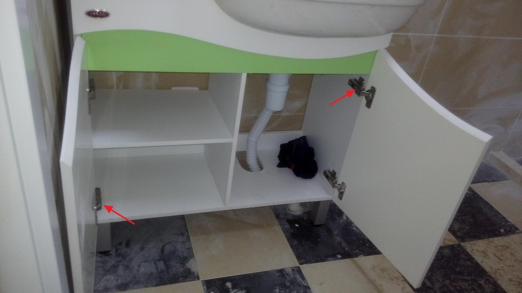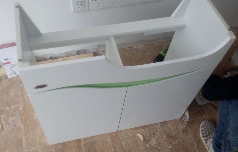 梁师傅去(抬起台盆柜)然后调节右边的两个地脚的高度,然后就调节好了