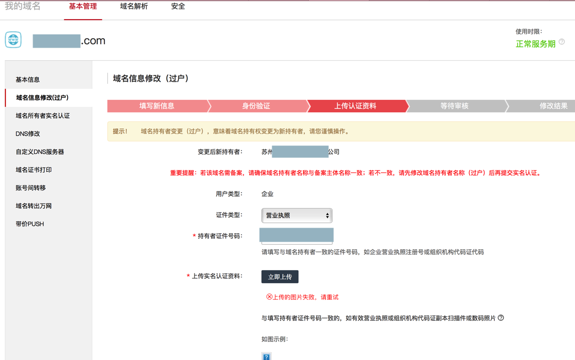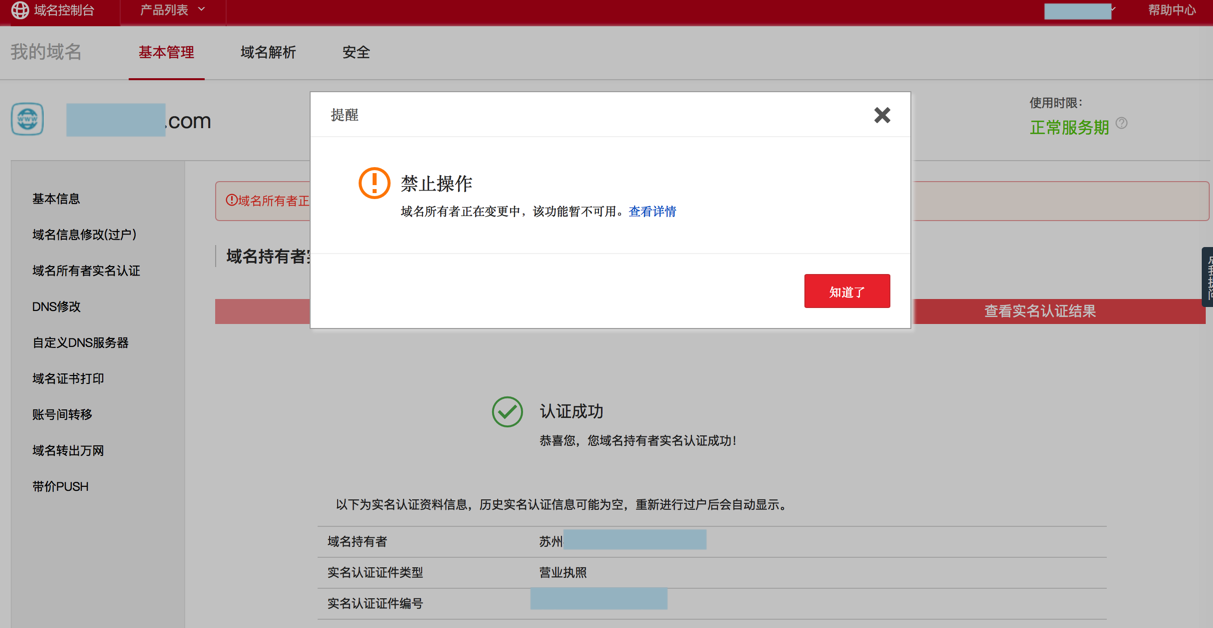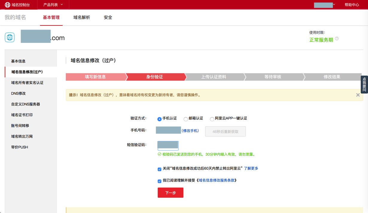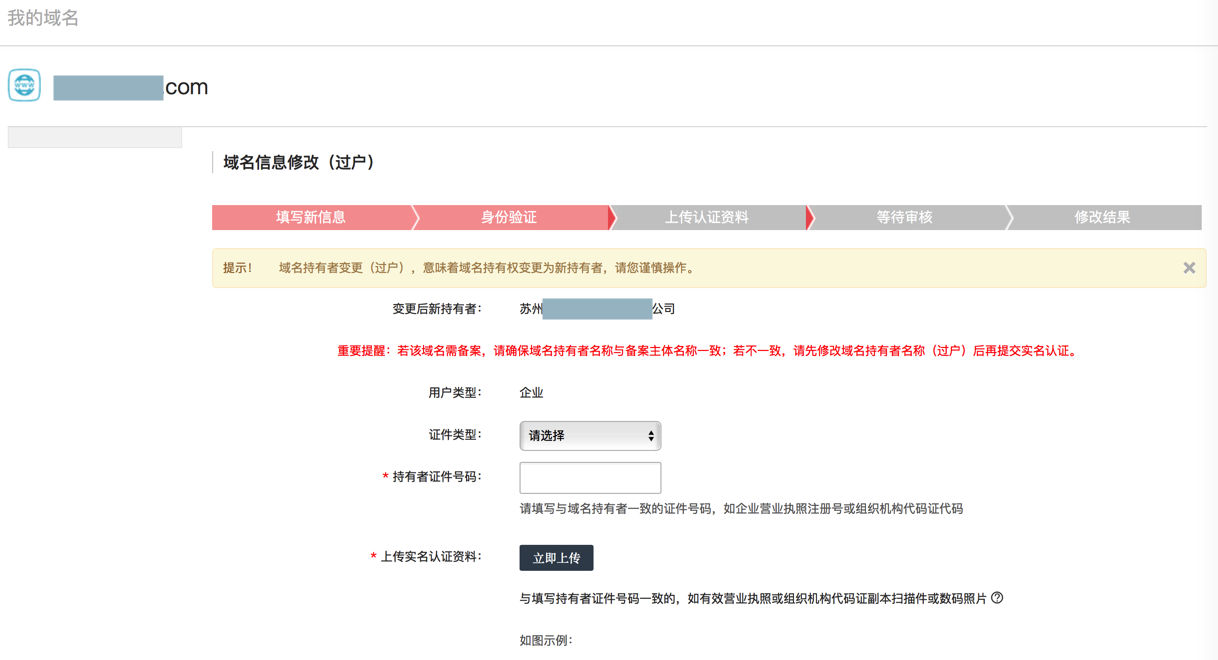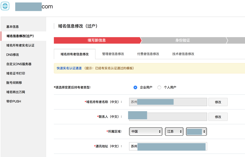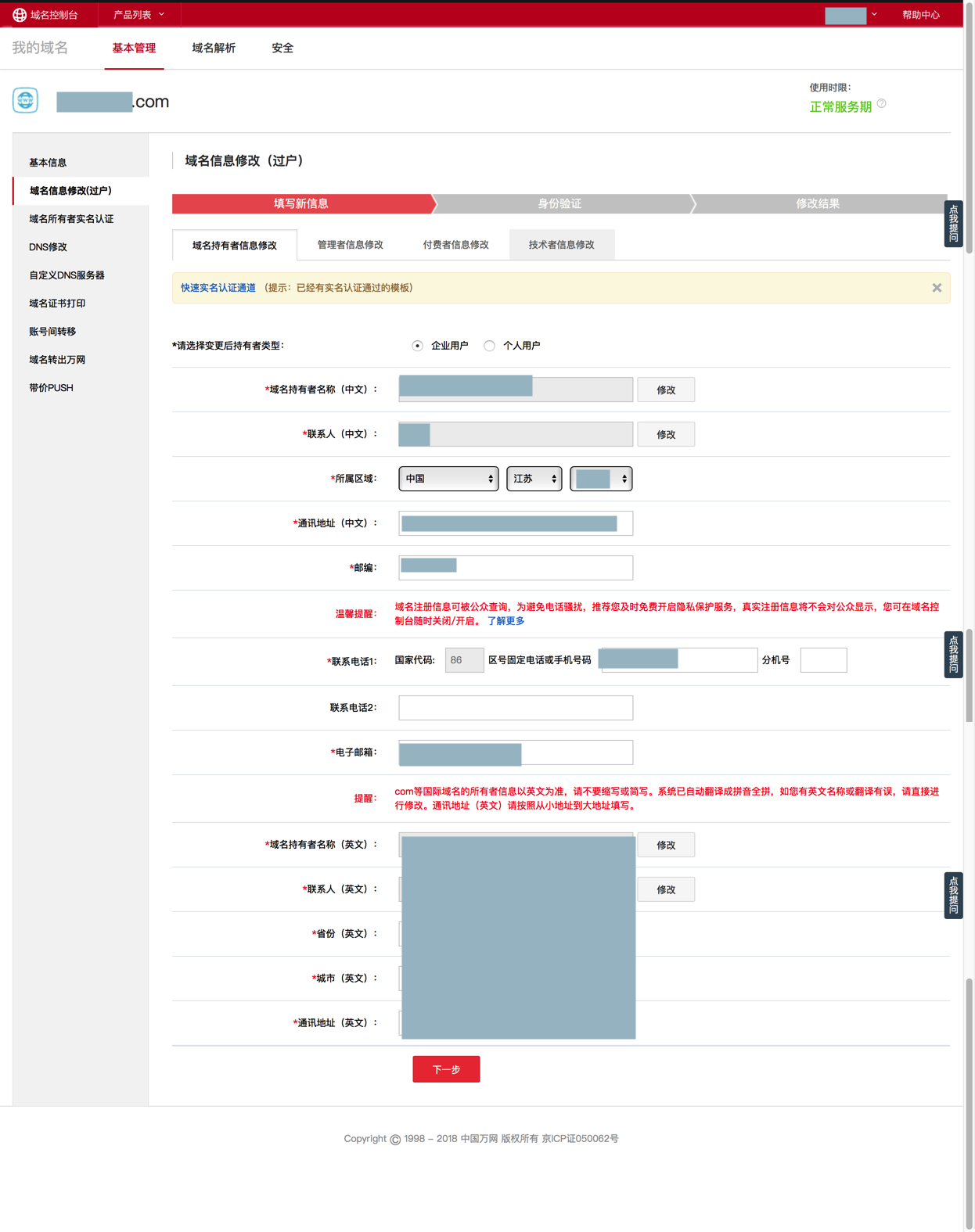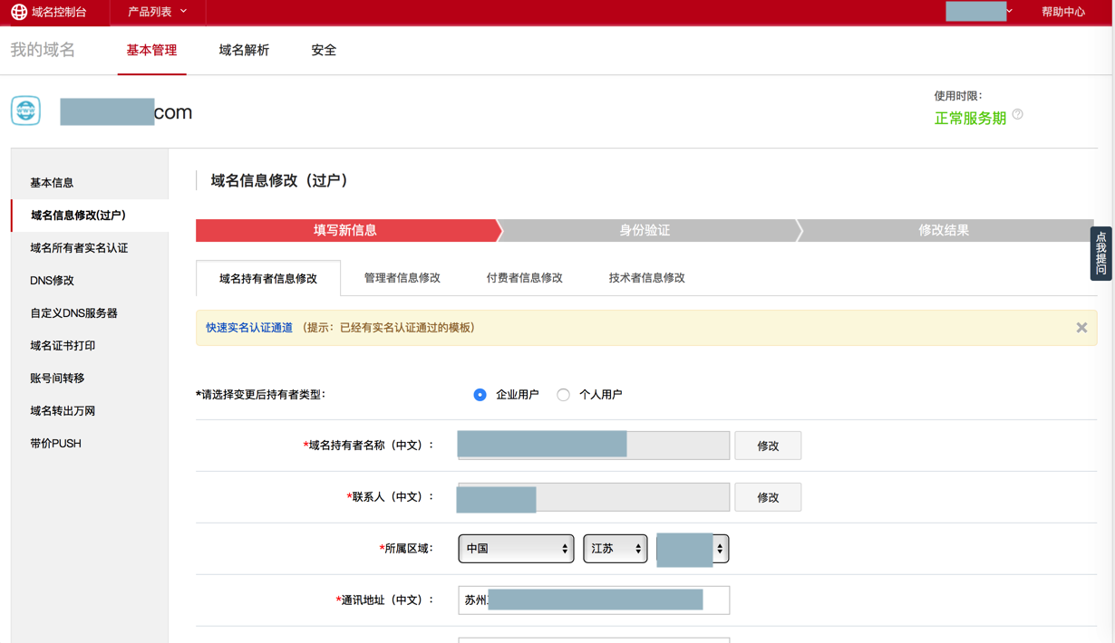 【重要】域名新转入成功后,需要登录域名控制台,通过进行域名所有者变更(过户)操作,及时补全域名信息。