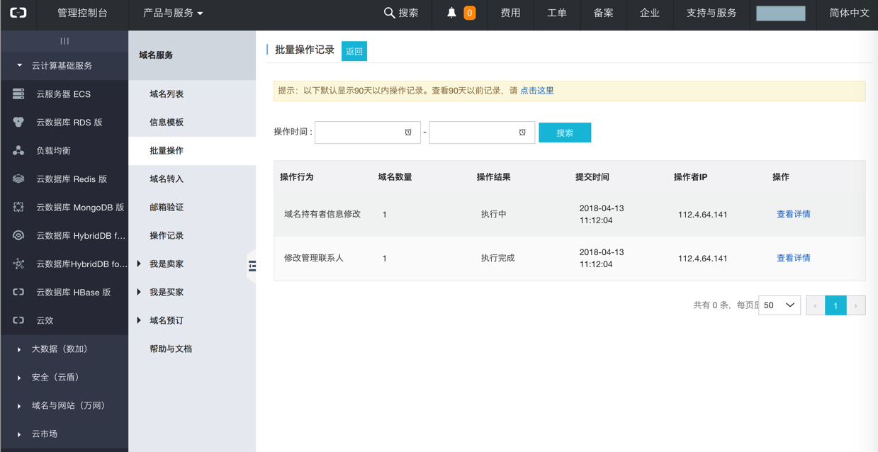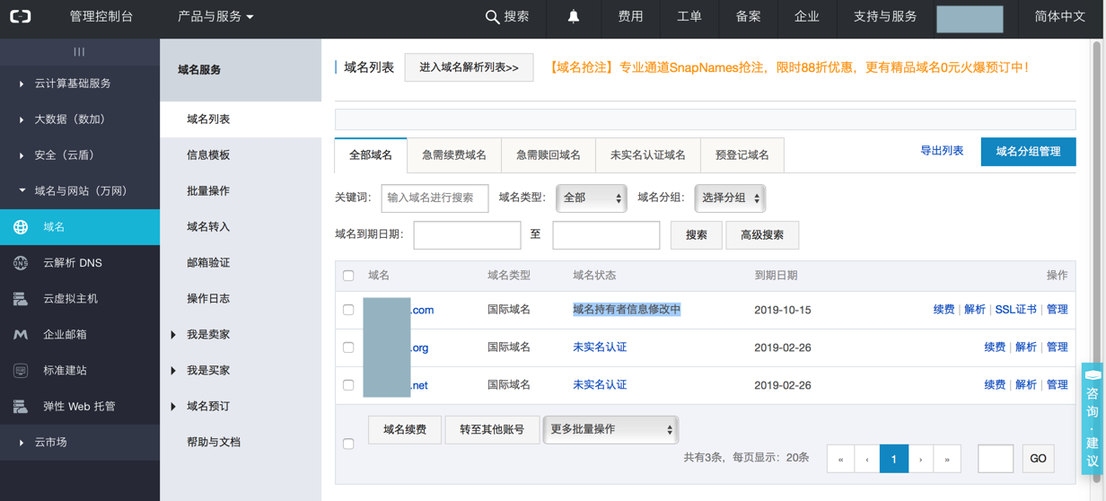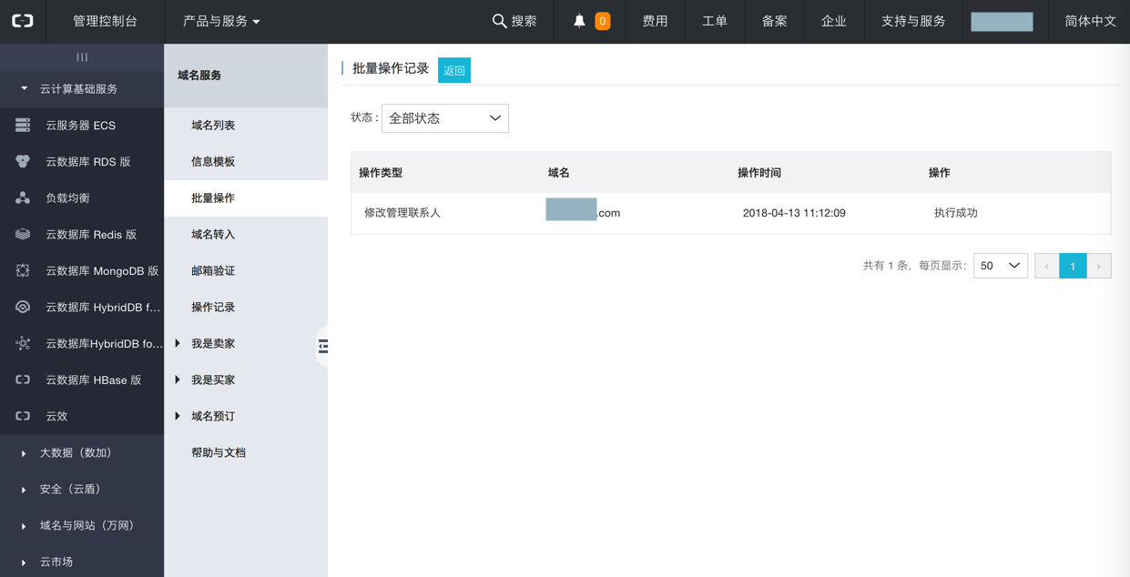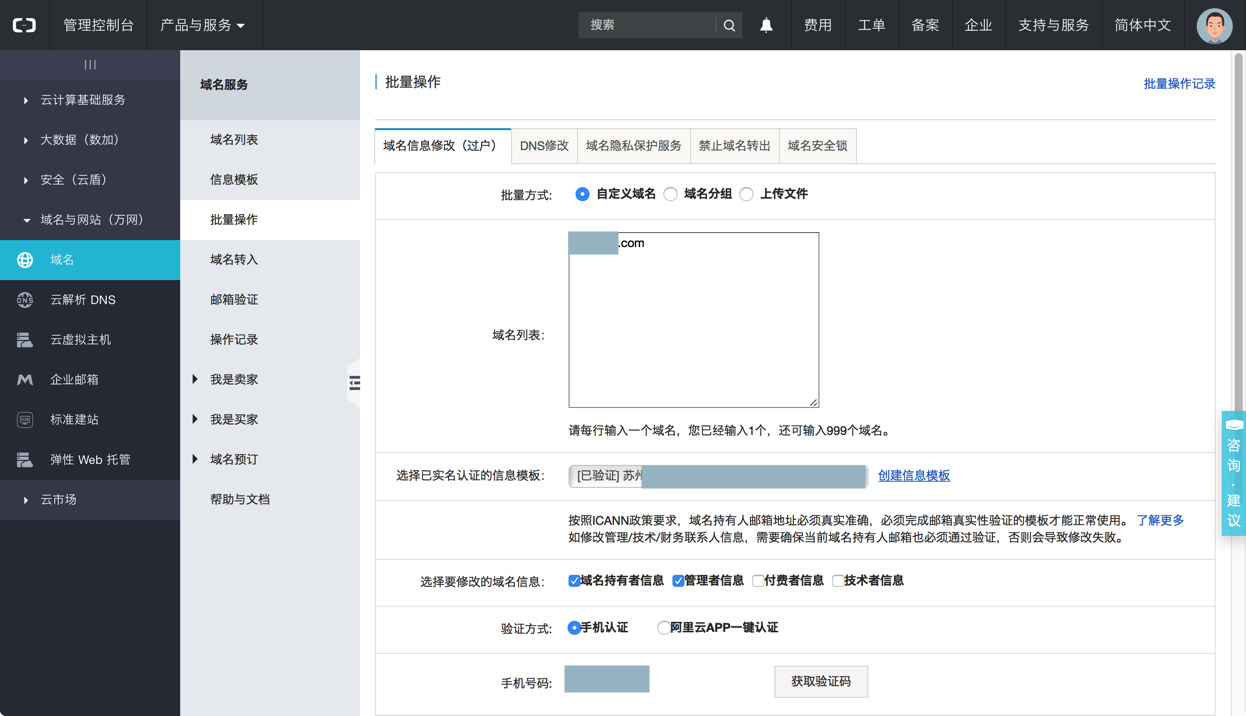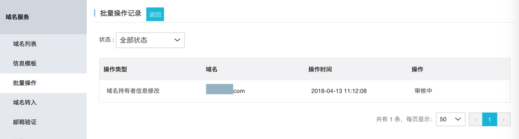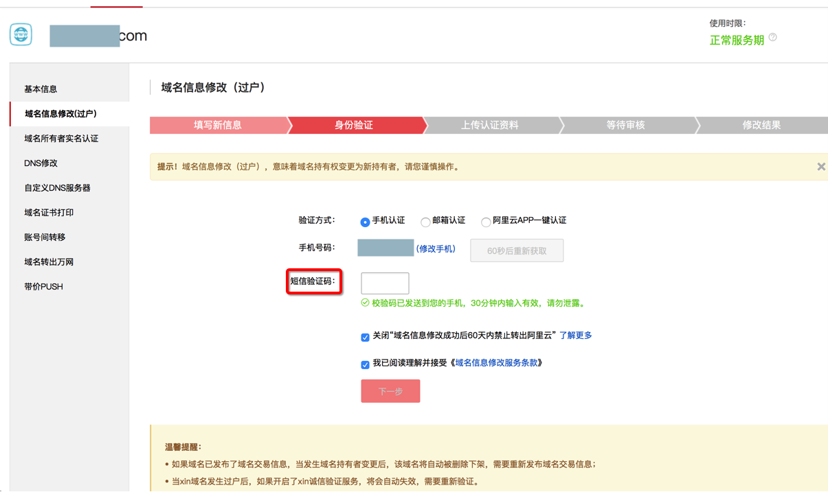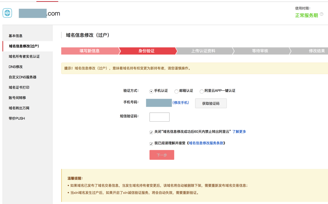 【重要】域名新转入成功后,需要登录域名控制台,通过进行域名所有者变更(过户)操作,及时补全域名信息。