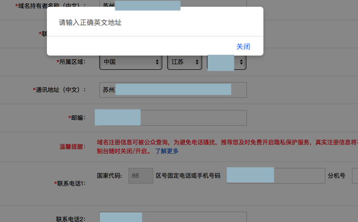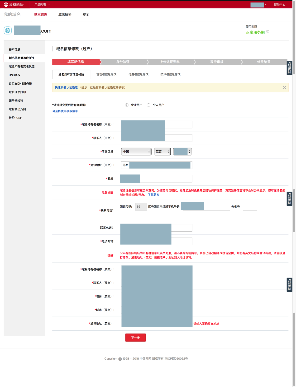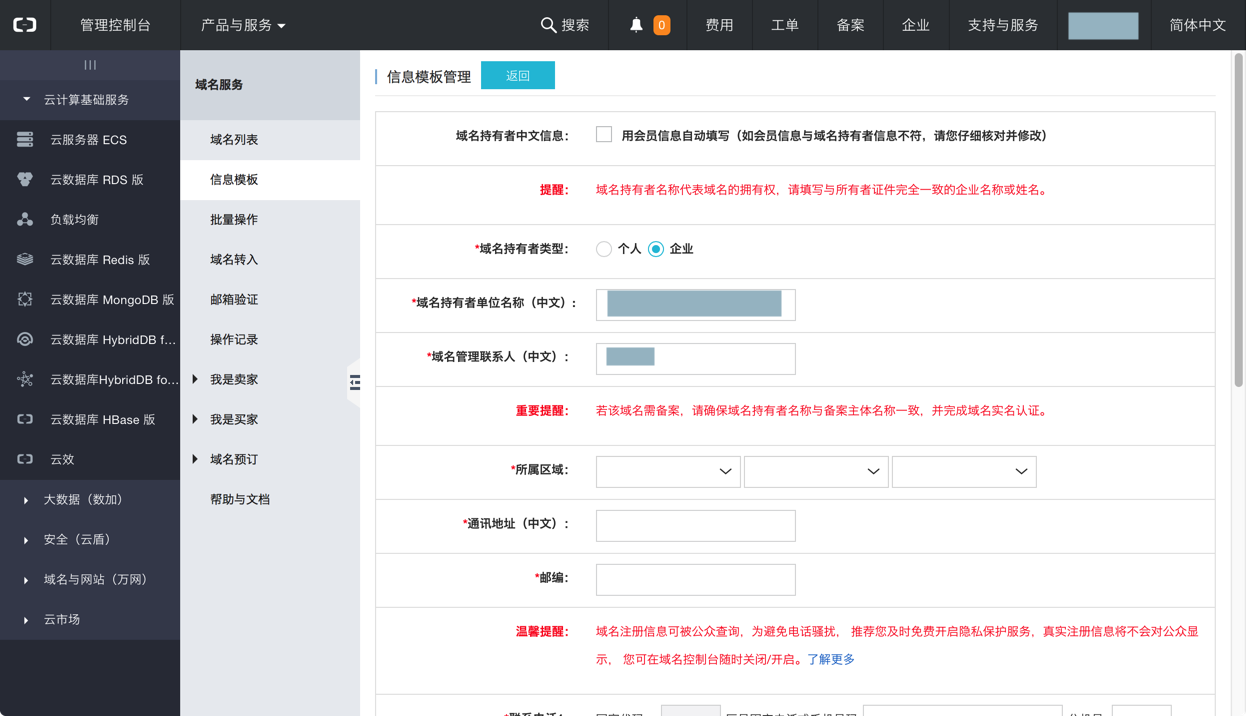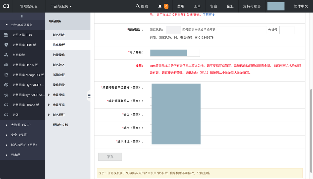 转载请注明:在路上 » 【暂不解决】域名已转入阿里云后尝试修改域名持有者的英文信息