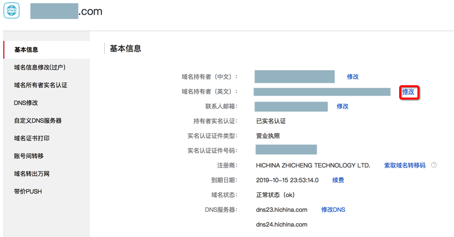 然后看到域名持有者显示的英文信息是中文的汉语拼音,显示很不专业,所以尝试去修改信息。