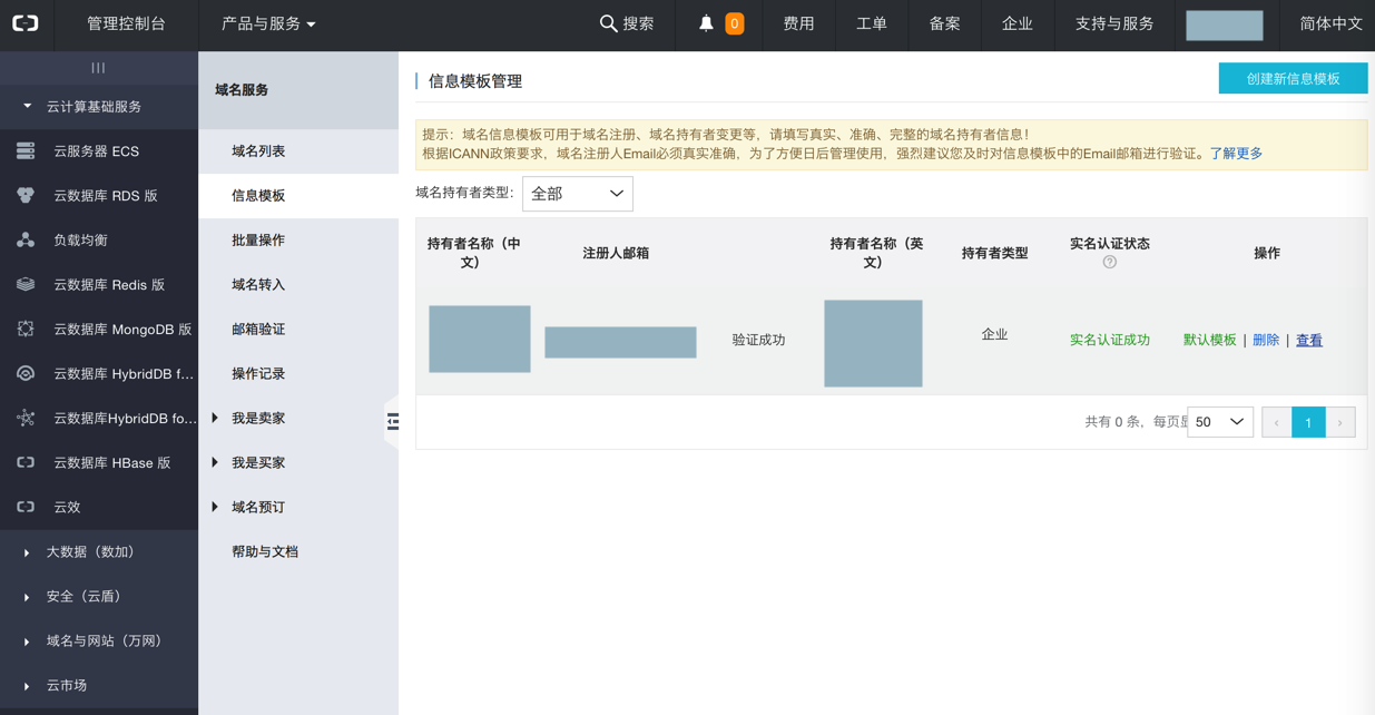 提示:信息模版属于“已实名认证”或“审核中”状态时:信息模版不可修改,只能查看。