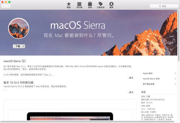 最后,还是用了Mac中下载的最新的macOS Sierra: