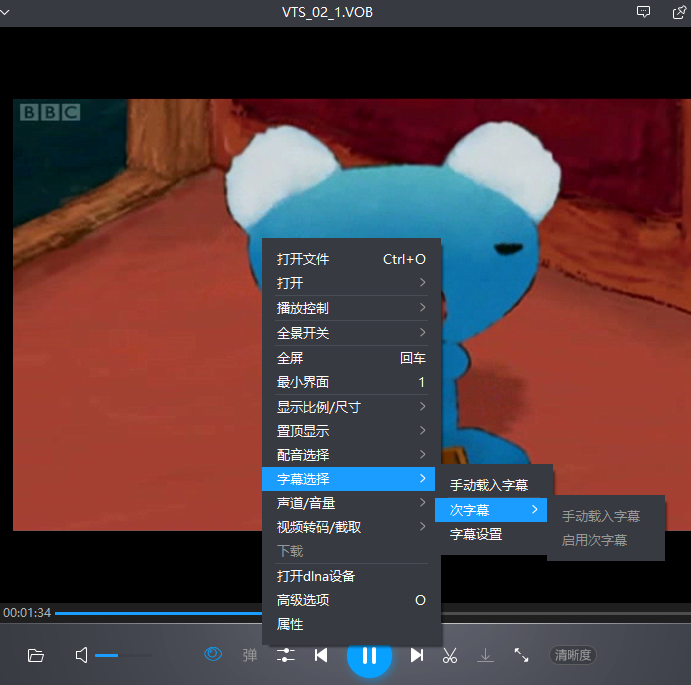 此处用暴风去播放其中一个Vob,结果还是找不到字幕: