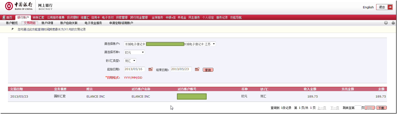 不过,速度那是真心快,从Elance中以欧元转到国内中行账户上,只花了2天就到账了。