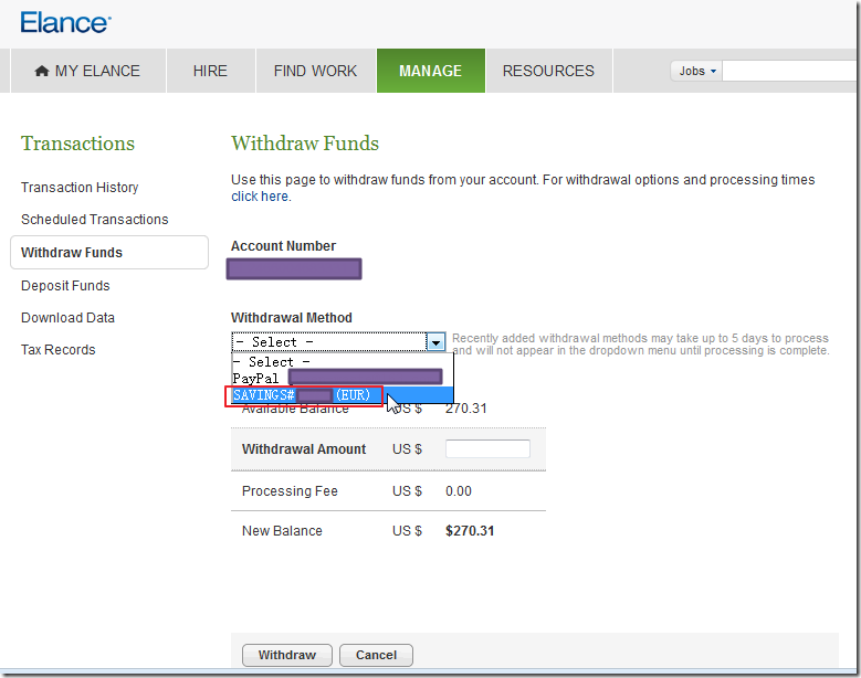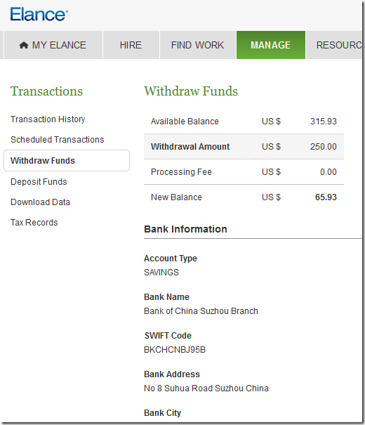 通过Elance,直接转账到我的国内的中行卡上,以欧元提现,即使是当月的第一次提现,也是要收5美元的手续费的。