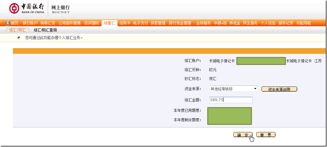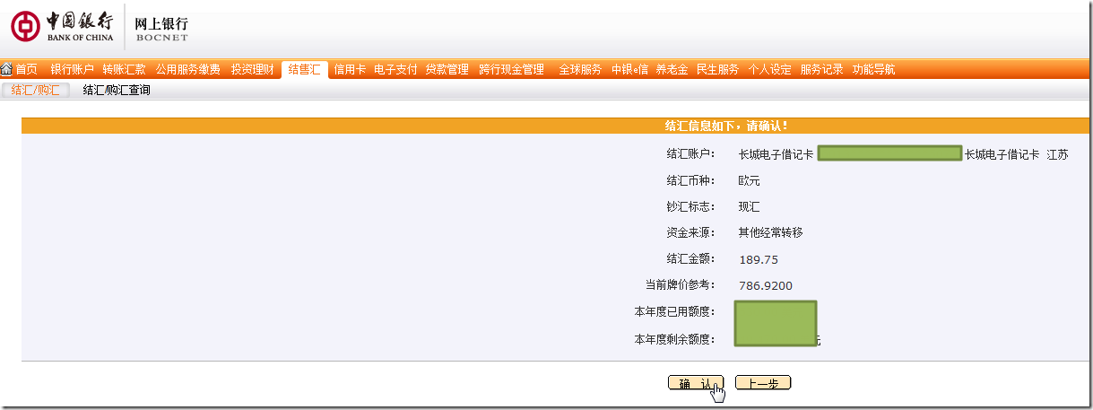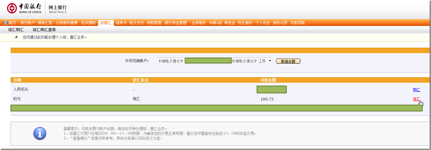 结售汇->查询余额->对于欧元,点击“结汇”,即可: