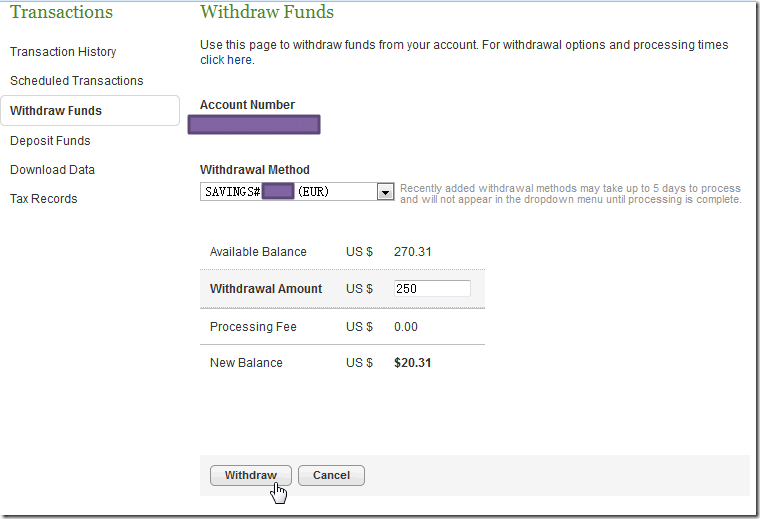 2.然后填上要取现的金额,再点击Withdraw: