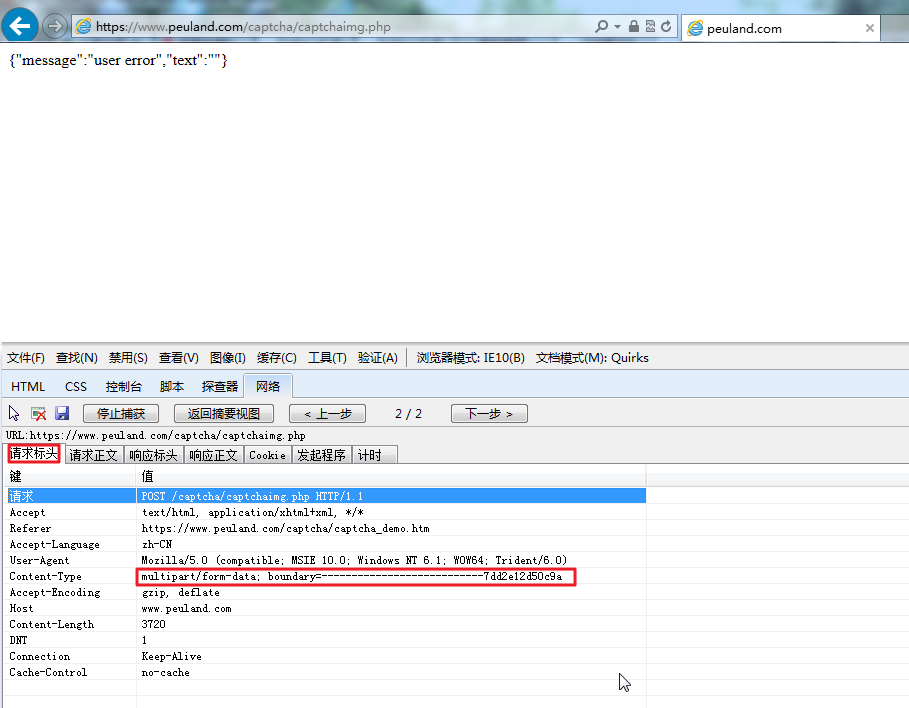 键 值 请求 POST /captcha/captchaimg.php HTTP/1.1 Accept text/html, application/xhtml+xml, */* Referer https://www.peuland.com/captcha/captcha_demo.htm Accept-Language zh-CN User-Agent Mozilla/5.0 (compatible; MSIE 10.0; Windows NT 6.1; WOW64; Trident/6.0) Content-Type multipart/form-data; boundary=---------------------------7dd2e12d50c9a Accept-Encoding gzip, deflate Host www.peuland.com Content-Length 3720 DNT 1 Connection Keep-Alive Cache-Control no-cache
