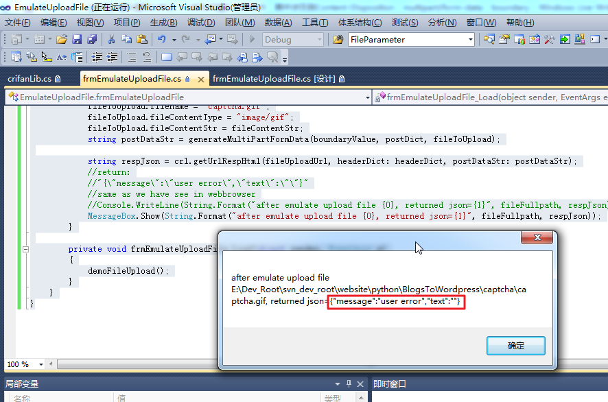 string respJson = crl.getUrlRespHtml(fileUploadUrl, headerDict: headerDict, postDataStr: postDataStr);