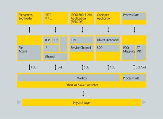 EtherCAT同时支援CANopen设备行规及Sercos驱动器行规。从CANopen或Sercos移植到EtherCAT时,在应用观点看到的内容是一様的,也可方便使用者或设备制造商的转换。