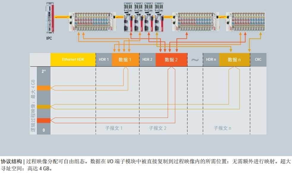 EtherCAT 技术突破了其他以太网解决方案的系统限制:通过该项技术,无需接收以太网数据包,将其解码,之后再将过程数据复制到各个设备。