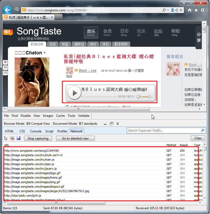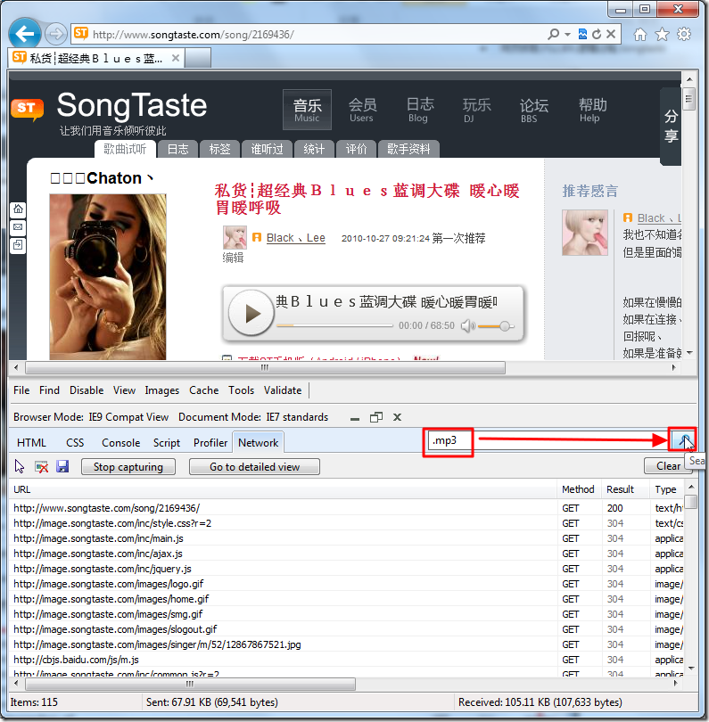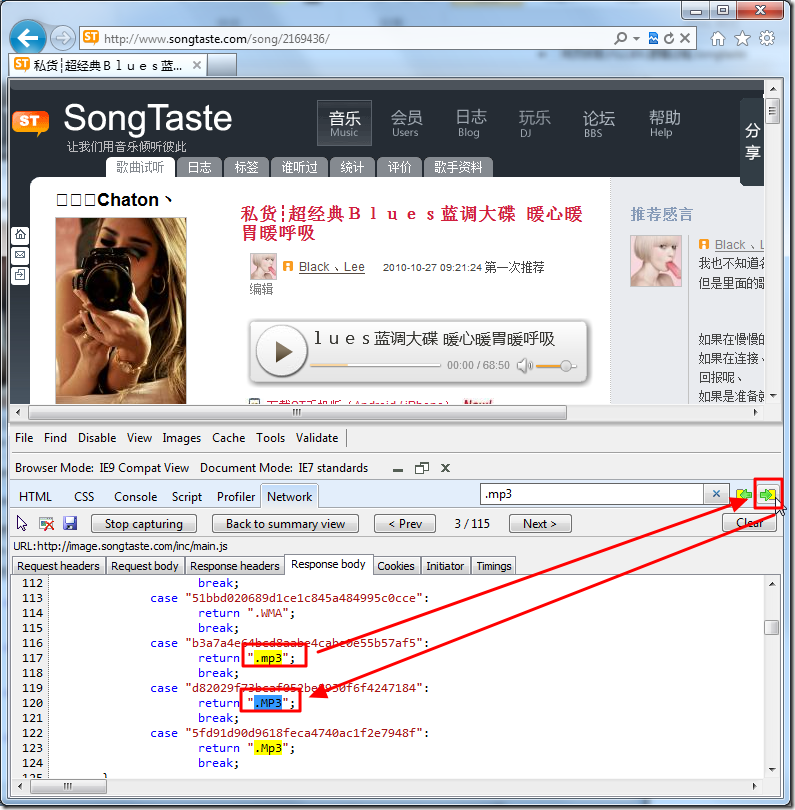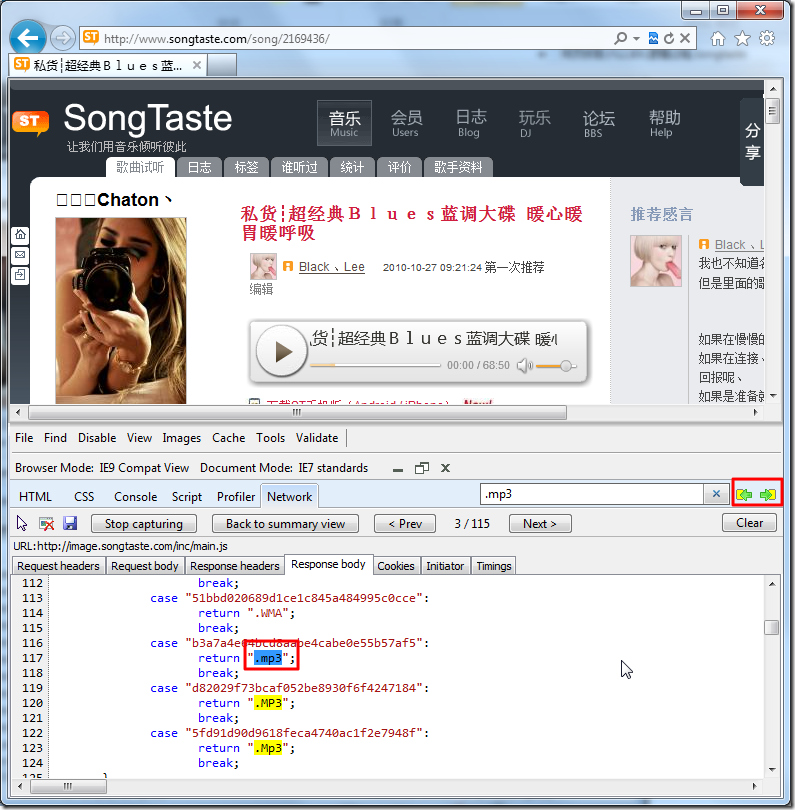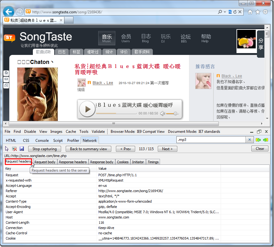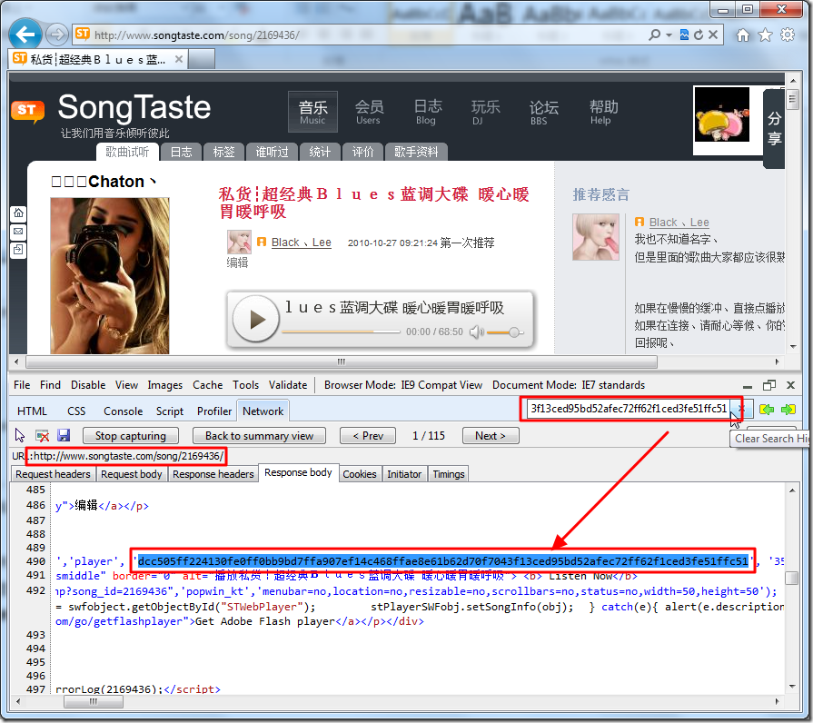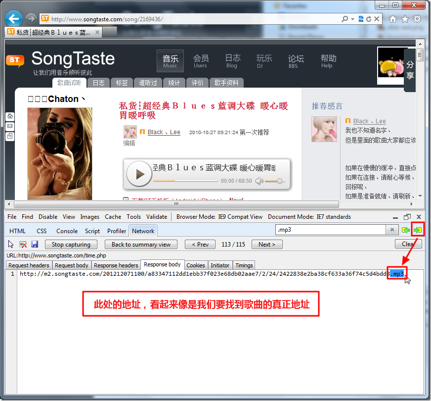 所以此处就去记录,或者说顺带演示一下,如何通过IE9的F12,去分析抓取,该首songtaste歌曲的真实url地址,以及这个地址是如何产生的。
