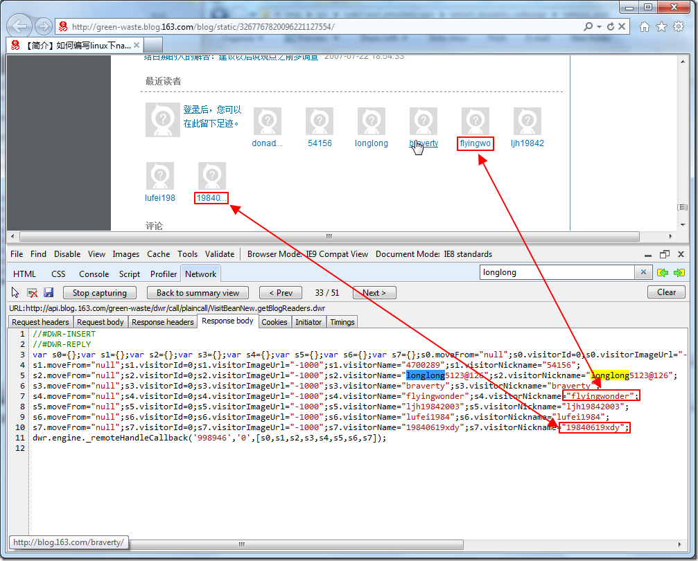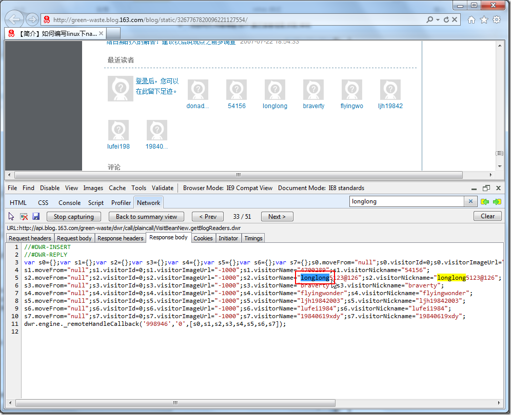 | 从 http://api.blog.163.com/green-waste/dwr/call/plaincall/VisitBeanNew.getBlogReaders.dwr 所返回的内容 | 提取我们要的longlong等读者信息 |