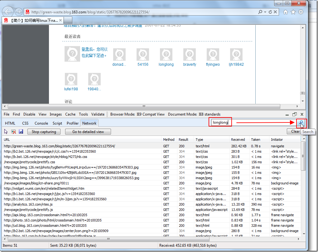 接下来,才是演示如何用IE9的F12,去分析此查找所需数据的过程。