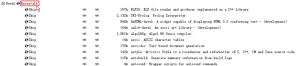 此处对于reinstall之所以变成skip,那是因为之前就没有安装过,所以此处对于之前没有安装过的模块,就是变成skip,即也不安装了。而如果你是第二次运行此cygwin安装程序,那么对于那些之前安装过的,则会变成对应的reinstall的。