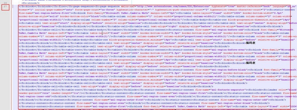 即,制定了输出的xml中,indent为no,即没有缩进,导致生成的(xml类型的)fo文件,内容都显示到一行中,显得很乱。在此种情况下,如果想要去调试的话,就只能是这样做:在Notepad++中,用搜索→行定位...(Ctrl+G),调出跳转对话框,选择“行”,然后输入错误行号,此处为27: