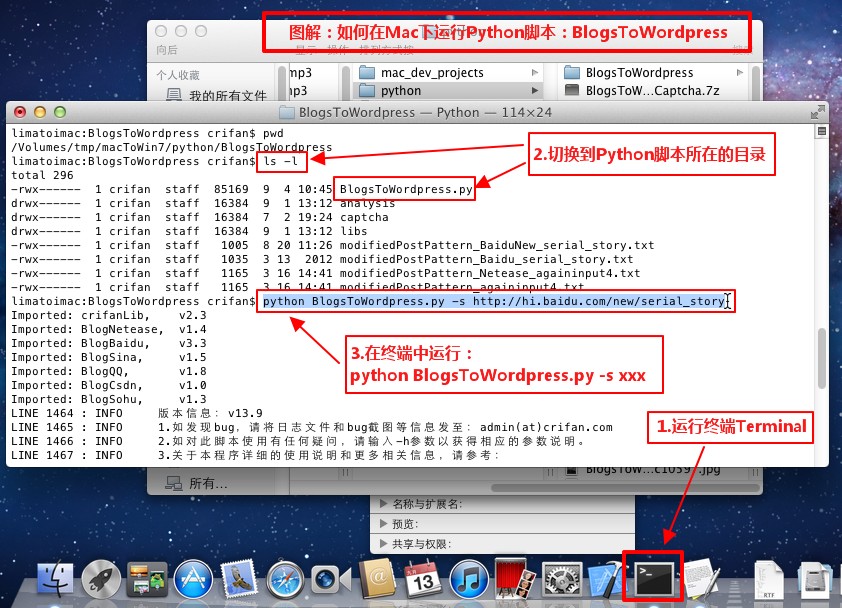 上述gif动画演示,只支持HTML在浏览器中的显示。其他格式输出中,比如PDF中,不支持此gif动画。所以下面再用文字解释一下大概流程:用文字解释如何在Windows的cmd中运行Python脚本BlogsToWordpress.py 如果你是在非HTML格式,比如PDF等,中查看此文,想要看动画的话,猛击动画演示如何在Windows的cmd中运行Python脚本BlogsToWordpress.py |