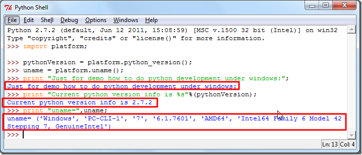 普通文本中输入python代码一样,在此一行行输入代码,然后就可以显示对应的信息了: