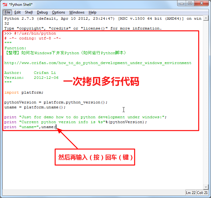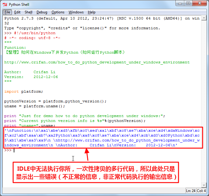 如果你对于IDLE的运行方式:交互式的,一行一行的输入,才能正常运行 不熟悉的话,作为新手,有些人会犯这样的错误: 在别处拷贝Python示例代码,然后一次性的粘贴多行代码到IDLE中