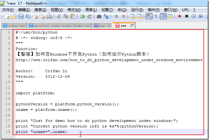 此处,推荐用Notepad++去写Python代码,做Python开发,的原因 除了本身Notepad++作为文本编辑器,好用之外, 还有一个,相对来说,比较重要的问题:字符编码 很多时候,由于Python开发者对于Python文件的编码,不太了解 导致在开发期间,出现很多,相对比较常见的字符编码的问题 所以,为了,更加深入的了解和学习,真正的掌握Python 有必要,从一开始学习Python的时候 就选用合适的工具,这样,避免后期,一些该知道的细节,尤其是文件的编码,不知道 而犯各种常见的错误 而关于Notepad++本身,不会使用,不熟悉,则可参考: 【crifan推荐】轻量级文本编辑器,Notepad最佳替代品:Notepad++ 关于Notepad++的几乎一切的内容,都可以在上述的教程中找到。 |