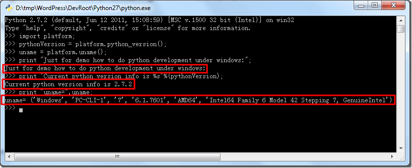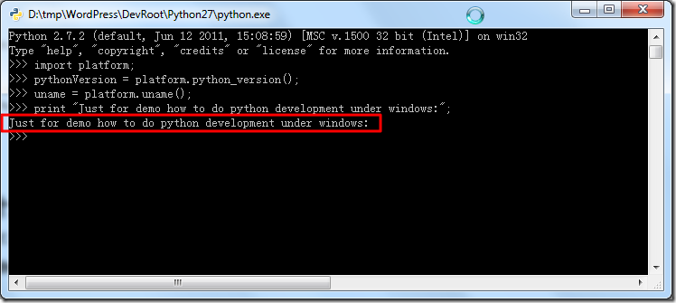 其中可以看到,当你输入对应的,第一行print时,此处命令行(command line)版本的Python Shell中, 就可以,动态的,交互式地,显示出对应的信息了。 正由于,此处可以,直接地,动态的,交互性式地,显示出对应的信息, 所以,才被叫做Python 的交互式的Shell,简称Python Shell。 |