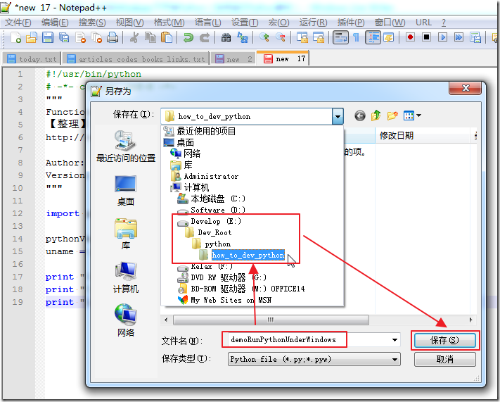 提示:其中可以看到Notepad++自动帮你写好了.py后缀,那是因为你之前设置了Python语法高亮。
