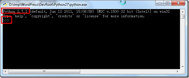 对于此用法不太熟悉的新手,需要注意一点的是,不要把,在Windows下的cmd中运行Python脚本,和在Python(安装好后自带有的)Command Line去写Python代码,运行Python代码,相混淆了 对于Python的Command Line,以我此处Python 2.7为例,是从开始菜单中找到的:开始菜单 ⇒ Python 2.7 ⇒ Python (Command Line),如图: 其打开后的效果如下: |