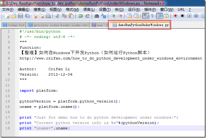 此处,推荐用Notepad++去写Python代码,做Python开发,的原因 除了本身Notepad++作为文本编辑器,好用之外, 还有一个,相对来说,比较重要的问题:字符编码 很多时候,由于Python开发者对于Python文件的编码,不太了解 导致在开发期间,出现很多,相对比较常见的字符编码的问题 所以,为了,更加深入的了解和学习,真正的掌握Python 有必要,从一开始学习Python的时候 就选用合适的工具,这样,避免后期,一些该知道的细节,尤其是文件的编码,不知道 而犯各种常见的错误 而关于Notepad++本身,不会使用,不熟悉,则可参考: 【crifan推荐】轻量级文本编辑器,Notepad最佳替代品:Notepad++ 关于Notepad++的几乎一切的内容,都可以在上述的教程中找到。 |
