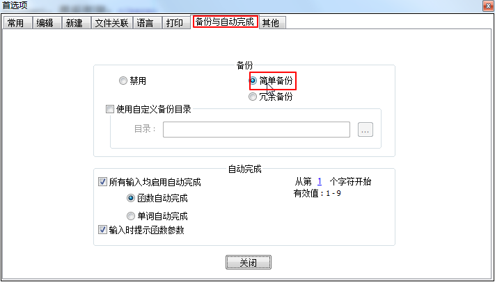 设置(T) ⇒ 首选项... ⇒ 备份 ⇒ 备份与自动完成 ⇒ 勾选 "简单备份"