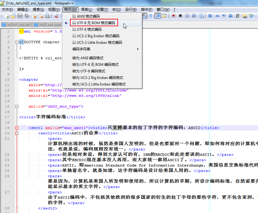 可以看到,当前xml文件所用字符编码类型为"以 UTF-8 无 BOM 格式编码"。