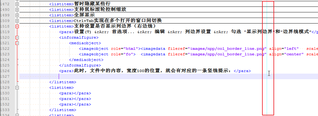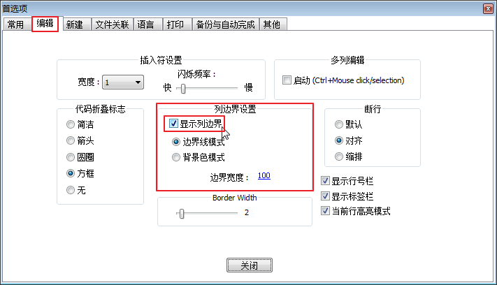 设置(T) ⇒ 首选项... ⇒ 编辑 ⇒ 列边界设置 ⇒ 勾选 "显示列边界"和"边界线模式"