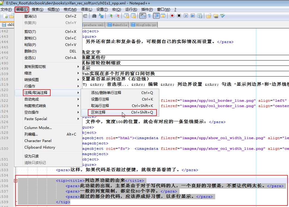 此功能,不仅方便一次性可以注释多行代码。更加强大的是,会根据不同的语言的代码,添加对应的注释前缀。 比如,Python语言,以井号"#"为前缀,表示注释,而c等语言,是以斜杠"/"为前缀,表示注释,而xml语言中,是以<!-- xxx -->表示对xxx进行注释,其都可以根据所识别出来的源码的类型,去添加相应的注释。 下面就是通过区块注释,实现对xml代码实现给一段代码,添加区块注释功能的: