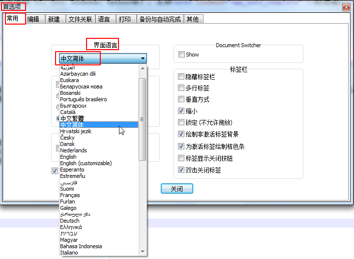 对应着Notepad++中的:设置(T) → 首选项... → 常用,中的“界面语言”:
