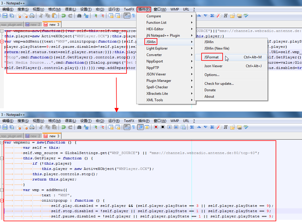 参考第 1.3.2.1 节 “手动安装插件”,去JSMinNpp下载JSMinNPP.1.11.2.uni.zip,解压后把JSMinNPP.dll拷贝到plugin目录即可。