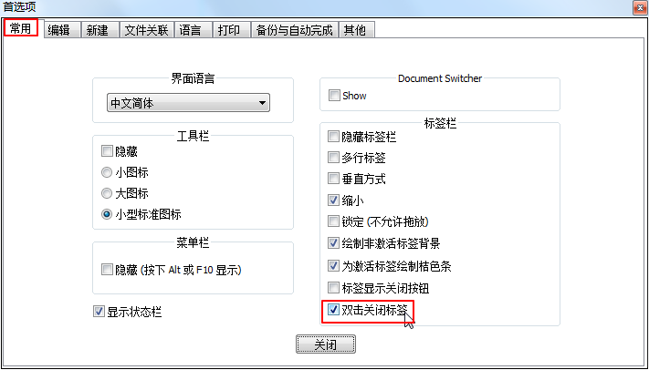 设置(T) ⇒ 首选项... ⇒ 常用 ⇒ 标签栏 ⇒ 勾选 "双击关闭标签"