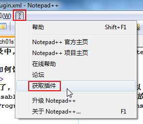 在Notepad++软件中,点击菜单栏左右边的那个问号,然后点击获取插件: