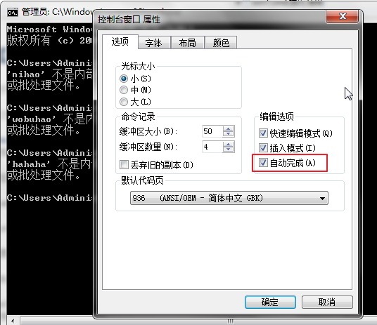 即,cmd中,右键窗口左上角的图标,选择 默认值,然后打开了 控制台窗口的属性 的对话框,对于其中的编辑选项中的自动完成,可以自己开启或关闭。