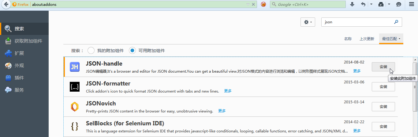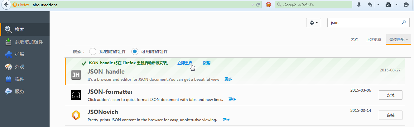 通过Firefox的工具->附件组件->搜索 json->会找到 JSON-handle,点击安装,重启Firefox后即可生效。