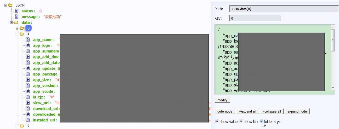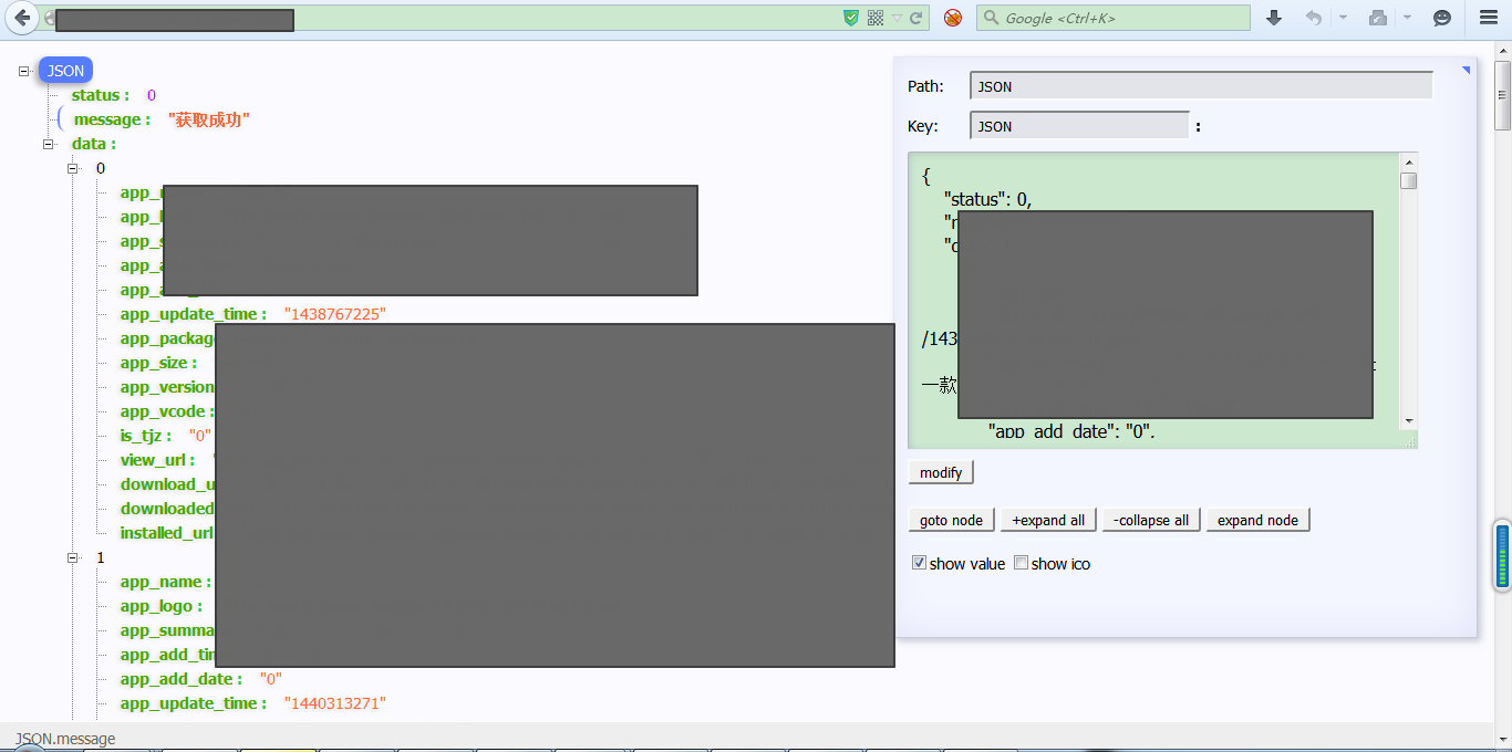 看到别人在Firefox上用了个JSON插件,可以很直观的显示json数据。效果很不错。