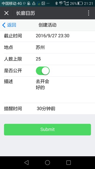 <!– Scrollable page content–> <div class="page-content"> <div class="list-block"> <ul> <li> <div class="item-content"> <div class="item-inner"> <div class="item-title label">标题</div> <div class="item-input"> <input type="text" placeholder="标题" /> </div> </div> </div> </li> <!–<li> <div class="item-content"> <div class="item-inner"> <div class="item-title label">起始日期时间</div> <div class="item-input"> <input readonly id="datetimepicker" type="text" > </div> </div> </div> </li>–> <li> <div class="item-content"> <div class="item-inner"> <div class="item-title label">起始时间</div> <div class="item-input"> <input type="text" placeholder="选取起始时间" readonly id="picker-date"> </div> </div> </div> <div id="picker-date-container"></div> </li> <li> <div class="item-content"> <div class="item-inner"> <div class="item-title label">截止时间</div> <div class="item-input"> <input type="text" placeholder="选取截止时间" readonly id="picker-date1"> </div> </div> </div> <div id="picker-date-container1"></div> </li> <li> <div class="item-content"> <div class="item-inner"> <div class="item-title label">地点</div> <div class="item-input"> <input type="email" placeholder="地点"/> </div> </div> </div> </li> <li> <div class="item-content"> <div class="item-inner"> <div class="item-title label">人数上限</div> <div class="item-input"> <input type="tel" placeholder="人数上限"/> </div> </div> </div> </li> <li> <div class="item-content"> <div class="item-inner"> <div class="item-title label">是否公开</div> <div class="item-input"> <label class="label-switch"> <input type="checkbox"/> <div class="checkbox"></div> </label> </div> </div> </div> </li> <li class="align-top"> <div class="item-content"> <div class="item-inner"> <div class="item-title label">描述</div> <div class="item-input"> <textarea></textarea> </div> </div> </div> </li> <li> <div class="item-content"> <div class="item-inner"> <div class="item-title label">提醒时间</div> <div class="item-input"> <select> <option>不提醒</option> <option>事件发生时</option> <option>5分钟前</option> <option>15分钟前</option> <option>30分钟前</option> <option>1小时前</option> <option>2小时前</option> <option>1天前</option> <option>2天前</option> <option>1周前</option> </select> </div> </div> </div> </li> </ul> <div class="cr-mask"></div> </div> <div class="content-block"> <div class="row"> <div class="col-100"> <input type="submit" value="Submit" class="button button-big button-fill color-green"/> </div> </div> </div> </div> |